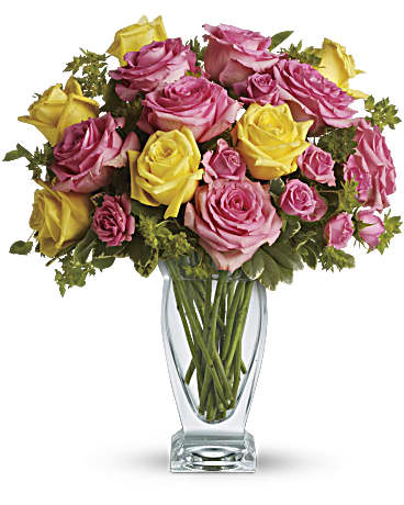 Pink lemonade, anyone? This stunning bouquet of pink and yellow roses adds an instant smile to anyone’s face – especially when they notice the gorgeous Couture Vase they get to keep using for years to come!